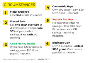 When a player lands on a Circumstances space, the number rolled that landed them to the box determines the situation they face and the financial consequence that follows.